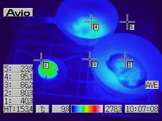 上記写真をご覧頂きます様に、アルミのフライパンは加熱2分後にまだ100℃以下でありながら、鉄製フライパン中央部の最高温度は既に280℃にも達しています。