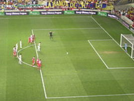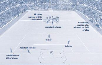 上記の様にロスタイムが何分になるかは、審判の裁量に委ねられていますので、それが長かろうが短かろうが、それは現在のルールに則しているので、文句を言ってはいけません。 また最近ロスタイム(失われた時間)という言葉は正確ではないので、アディショナルタイム(追加時間)と呼ぶべきだと言うネット記事がありますが、原文ではThe allowance for time lostとあり、どうみてもあまり意味のある議論ではなさそうです。 8. ペナルティーキックペナルティーキックは、ペナルティーエリア内で守備側の反則があった場合、或いは同点のままゲームが終了した場合行われます。 手順も簡単で、ペナルティーマーク上に置いたボールをキッカーが蹴ってキーパーが守るだけです。 ![]() 試合中のペナルティーキックの様子 ただし見守る競技者の位置が異なります。 試合中のペナルティーキックの場合、他の競技者はボールの後ろ側で、且つペナルティーエリアとペナルティーアーク内に入ってはいけません。 一方同点後のペナルティーキックの場合、以下の様に他の競技者はセンターサークル内で見守る必要がります。